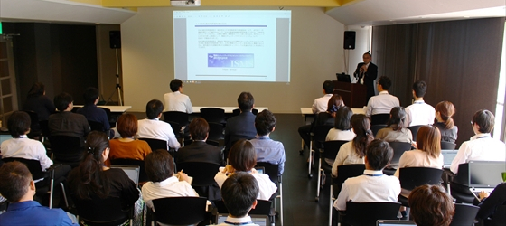 約100名収容のセミナールーム。大型プロジェクト、PA装置を完備。