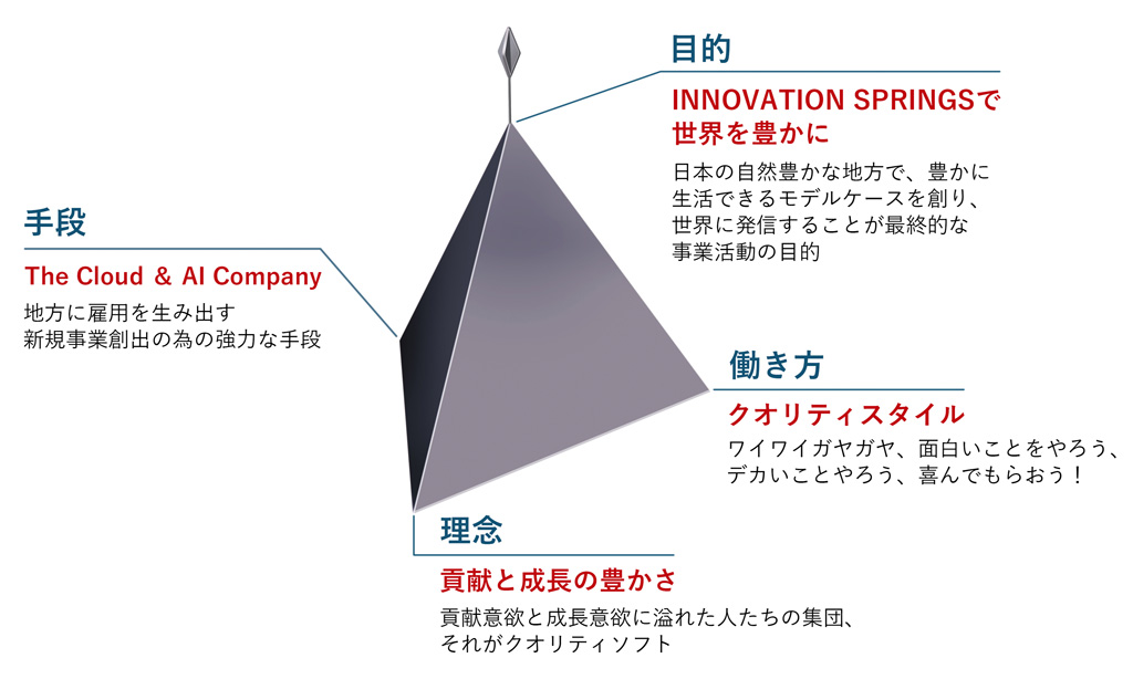 クオリティソフトは、豊かな世界の創造に貢献する企業に成長します。メンバーは、その目的への貢献を通じ職業人として、企業人として、世界人として、そして人間として成長します。