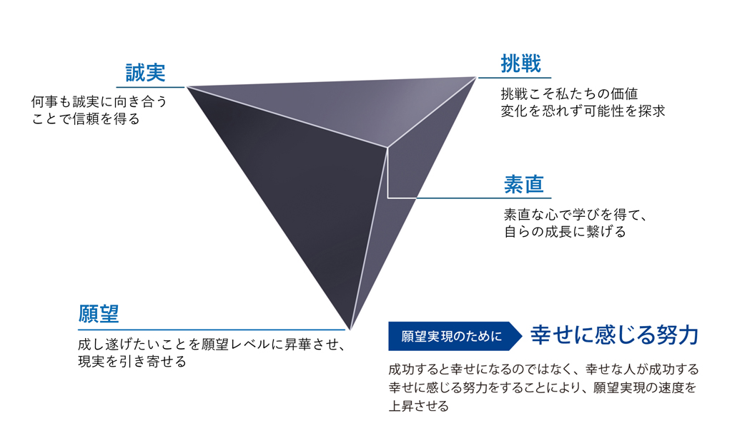 挑戦こそ私たちの価値。困難や未知のことに対して積極的に立ち向かい、試みます。既存の状態に甘んじず、新しい目標や課題に取り組む姿勢で行動します。