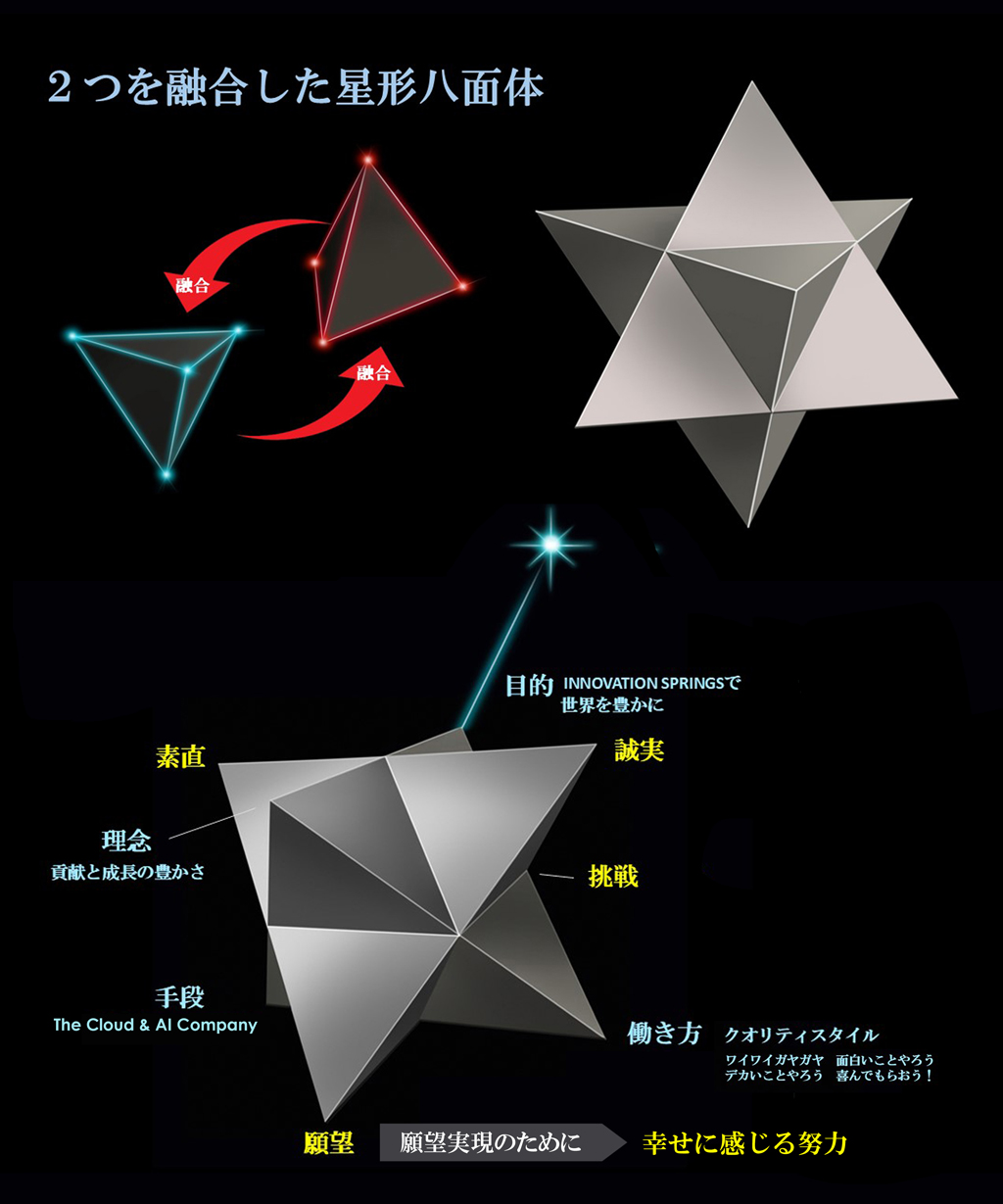 ポラリスマカバは、100年企業への羅針盤です。組織が向かう方向を示す上向き正四面体と、メンバーの力が発揮される方向を示す下向き正四面体の2つを融合した星形八面体(マカバ)を用いて表現されています。また、マカバの向かう方向は、頂点が北極星(ポラリス)を指し、決してぶれず普遍であることを示すため、ポラリスマカバと名付けました。クオリティ・ポラリスマカバはクオリティソフトが100年企業に向かうための羅針盤です。
